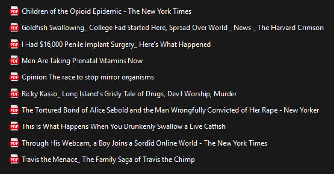 Last year, I began saving articles that stood out to me, stuff that’s either exceptionally well-written or exceptionally intriguing (preferably both). Some are new, some are old, but they’re all fodder for my imagination.